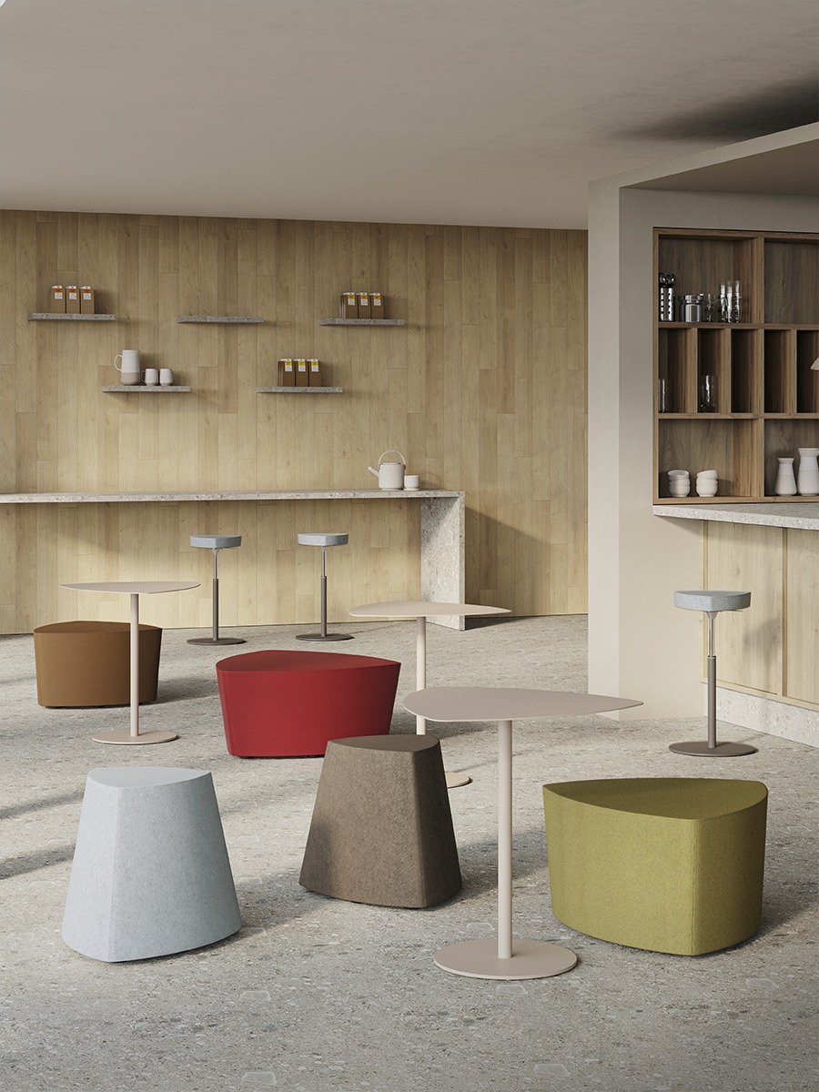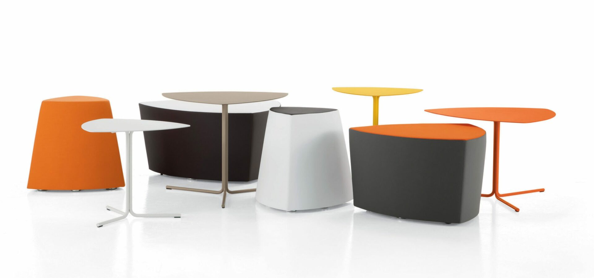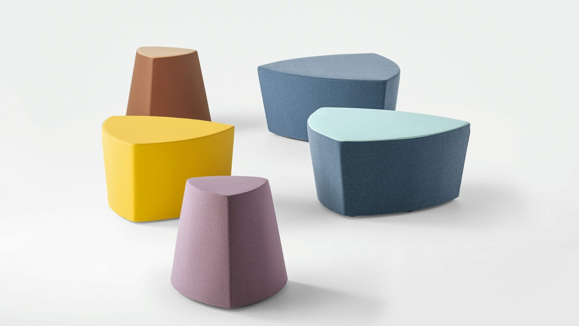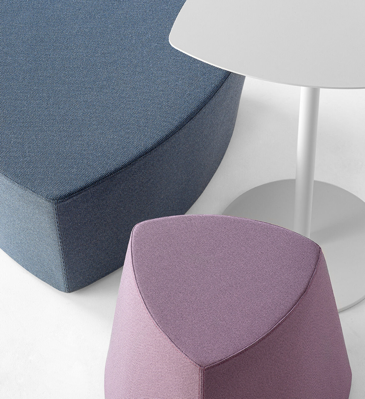 Les poufs Kensho font partie de la collection Lounge - Sofa de Kastel. Le pouf de forme triangulaire arrondie Kensho, design de Franco Driusso, est disponible en 3 dimensions, avec patins ou roulettes, avec revêtement unicolore ou bicolore.